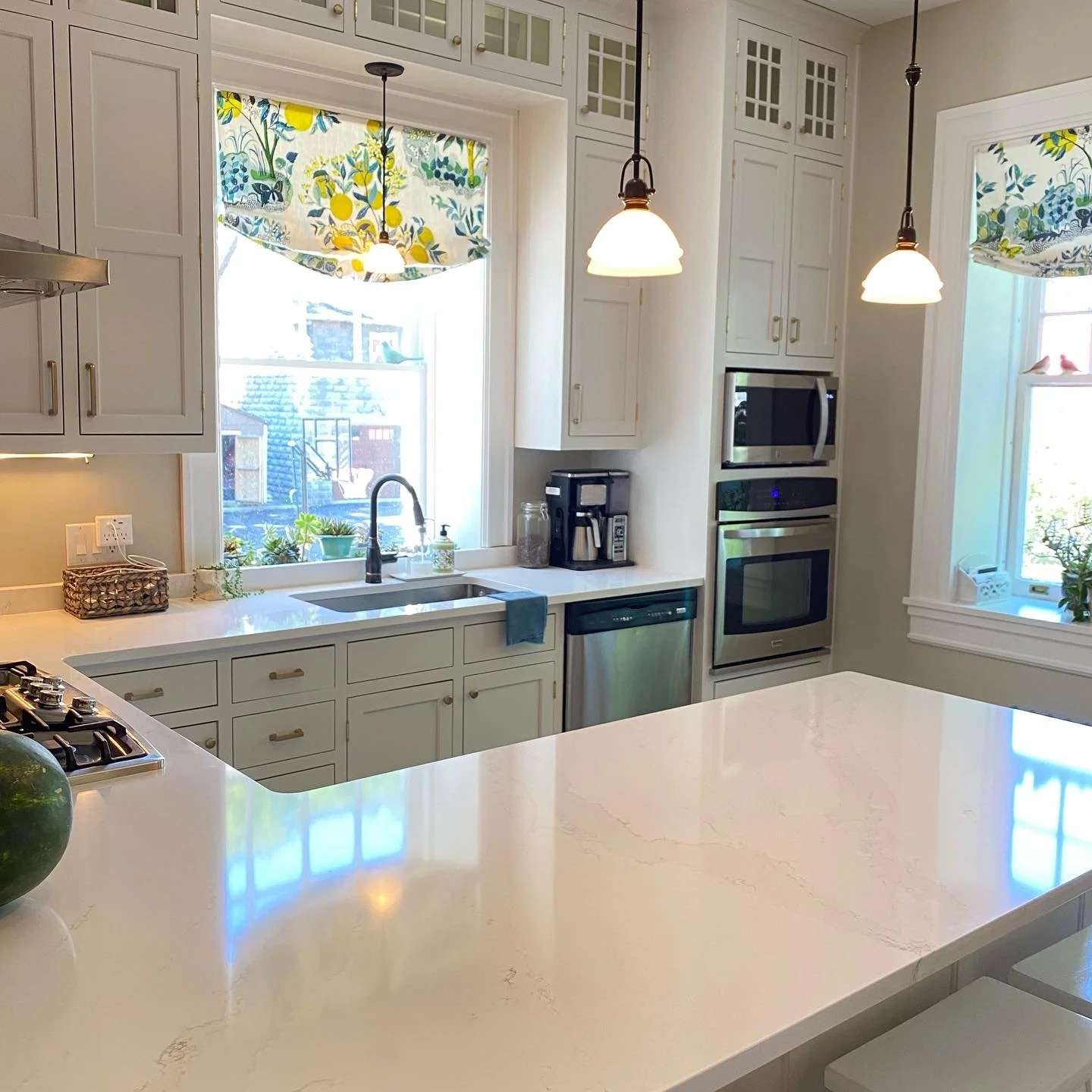 We transformed this kitchen by painting the cabinets, and extended the peninsula to create a space for stools. The dark counter top was replaced with a lighter quartz. Custom window treatments add color and personality. New hardware completed the look. A new tile backsplash will be added.