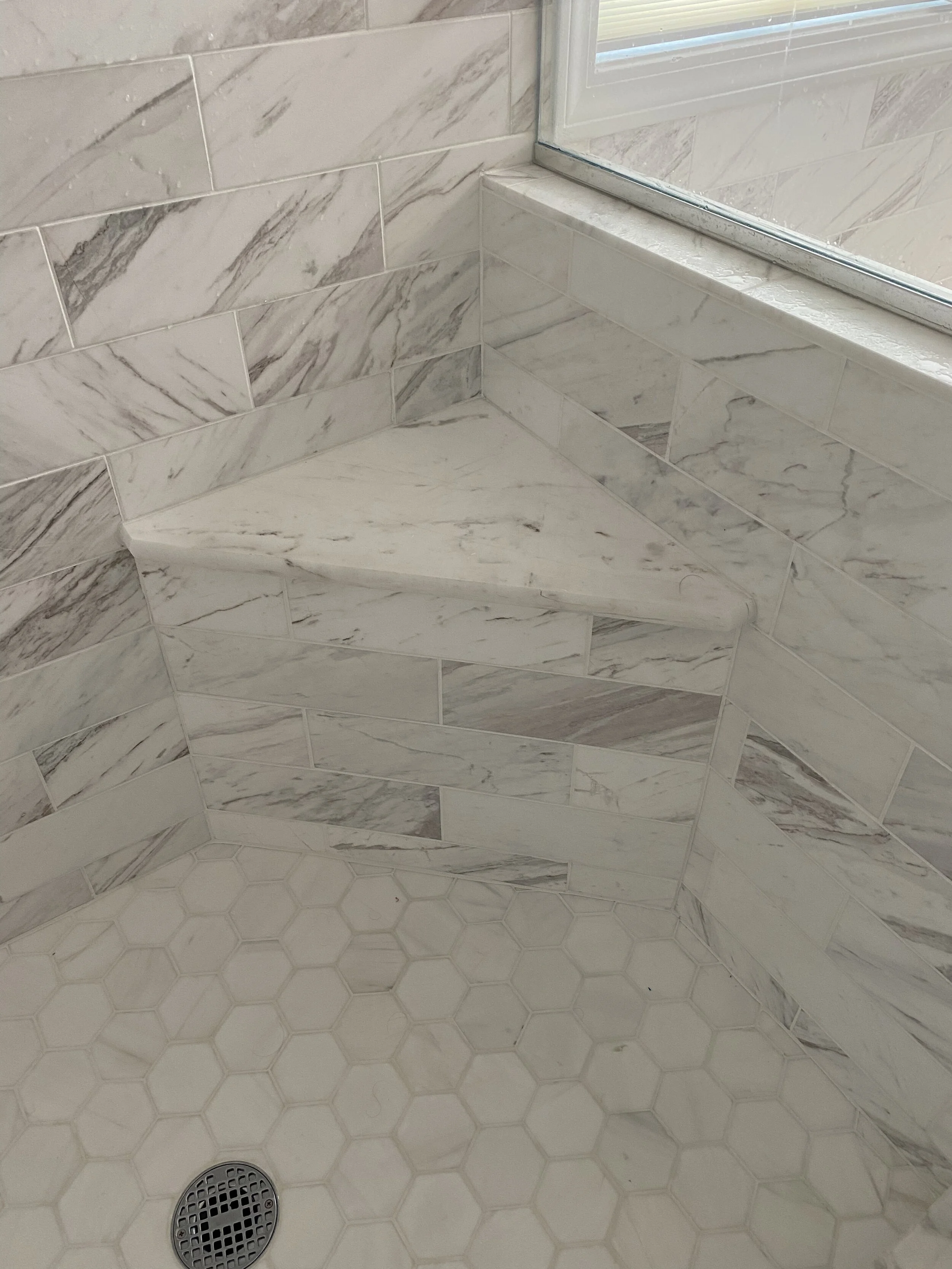 This master bathroom was entirely renovated to create a relaxing spa like retreat for the homeowners. Finishes include marble floors and shower and walls with a glass and marble deco tile for interest and variety, quartz counter tops, walk in shower with niche, rain head, and wand. The vanity was customized to look like piece of furniture, the beveled mirrors are flanked with decorative sconces, the soaking tub is finished with a recessed panel design to tie into the cabinetry. A lantern style chandelier illuminates this area. Custom window treatments include pleated shades and a soft top treatment provide interest, softness and privacy.